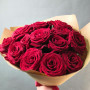На фото букет из 13 бордовых роз. В составе: роза 13 шт, крафт-бумага 1 шт, атласная лента 1 шт, . Все цветы свежие и ароматные, букет красиво оформлен и отлично подходит для подарка. Доступна доставка цветов или самовывоз.